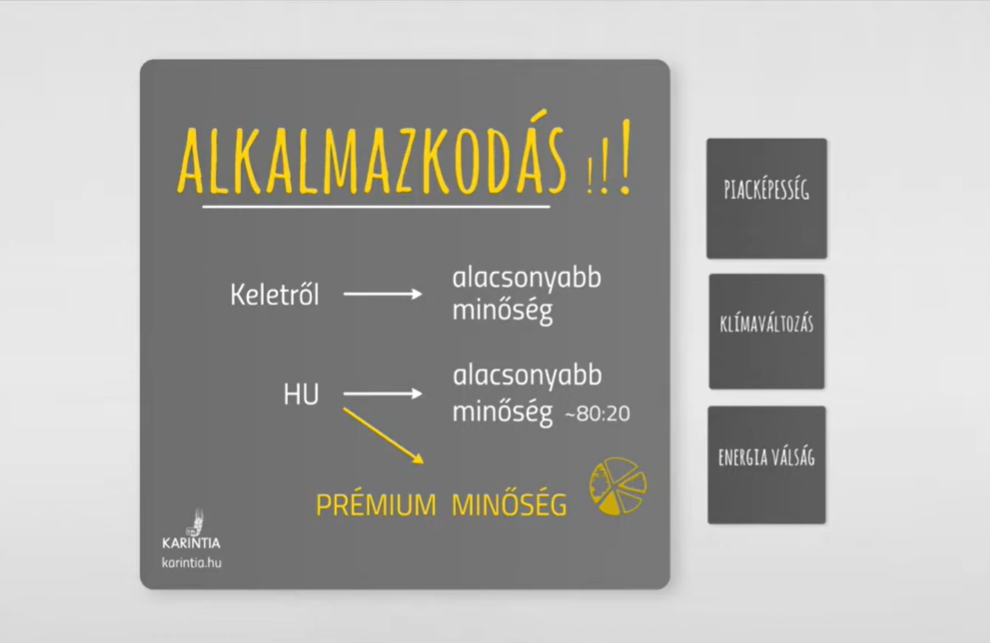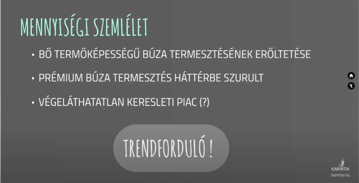 A Karintia Kft. a prémium minőség termesztési arányának növelésében hisz: ez lehet az egyik kiút az óriási, mennyiséget mellőző túlkínálatból. A piacképesség kulcsszóvá vált – olyan fajtatiszta, homogén prémium minőségű, magas reológiájú tételeket kell előállítani, amelyek megfelelnek a piac konkrét igényeinek, és amelyekkel értékesíthetőbb, jövedelmezőbb termelést lehet folytatni.