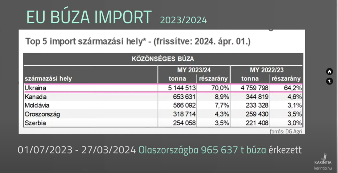 Ukrajna a világ hetedik legnagyobb gabonatermelője és az ötödik legnagyobb exportőre. Az EU-ba irányuló gabonabeáramlás mértéke példátlan: a 2023–24-es gazdasági év első 47 hetében több mint 5,1 millió tonna gabona érkezett ukrán forrásból, miközben az éves import mennyiség akár a 10 millió tonnát is elérheti. Ez komoly versenyhátrányba hozza a magyar termelőket is, különösen a gyengébb minőséget előállító régiókat.