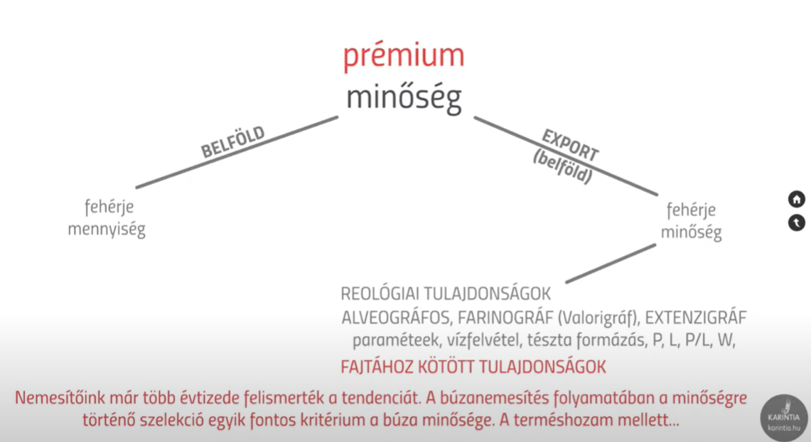 A Karintia vezetője szerint a magyar termelés jellemzően még mindig a mennyiségi szemléleten alapul: sokszor elég a hektoliter-tömeg és a sikér, de az exportpiacok – különösen Ausztria és Olaszország – reológiai paramétereket várnak. Ilyenek például a P, L, W paraméterek, amelyeket tipikusan alveográfos és farinográfos vizsgálatok határoznak meg. Ezek a tulajdonságok genetikai adottságok, tehát már a fajta megválasztásakor eldől, hogy a termény képes lesz-e megfelelni a prémium elvárásoknak.