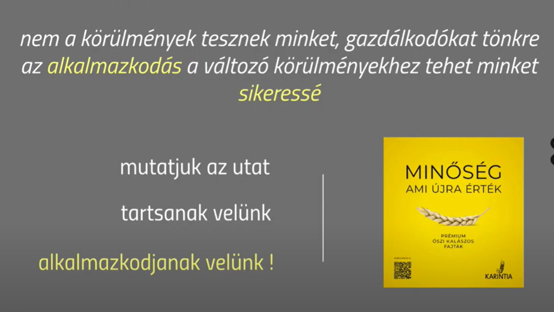A Karintia érdekeltségi köréhez tartozó nemesítőházának fejlesztéseként született Sambadur fajtája akár 8 tonna/hektár feletti üzemi átlagokat ért el, minőségi kompromisszumok nélkül. Az előadás végén Bene Zoltán kiemelte: a siker kulcsa az alkalmazkodás – „nem a körülmények tesznek minket, gazdálkodókat tönkre, hanem az ALKALMAZKODÁS a változó körülményekhez tehet minket SIKERESSÉ.” A Karintia szakértői csapata, a vetőmagtól a termények piacra juttatásáig, országos lefedettséggel áll a termelők rendelkezésére.